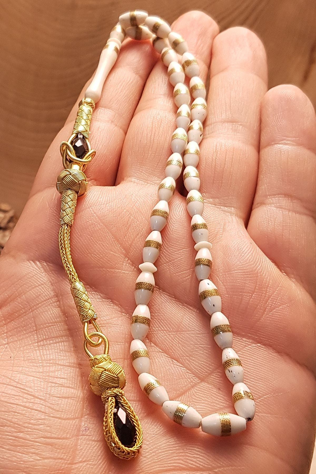 Altın kaplama detaylarıyla zenginleştirilmiş, şık ve zarif bir tasarıma sahip; Doğal taş kullanımı sayesinde her bir tesbih tanesi benzersiz ve otantik bir görünüm sunar; Sevgililer günü ve babalar günü gibi özel günlerde anlamlı bir hediye seçeneği olarak idealdir; Tesbihin her bir taşı, el işçiliğiyle özenle seçilmiş ve işlenmiştir, bu da her kullanımda kaliteyi hissettirir;