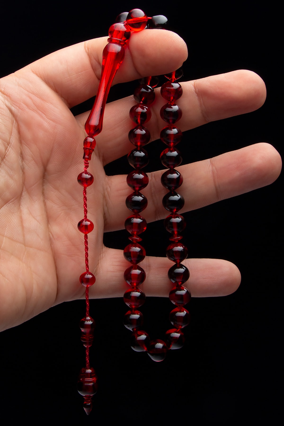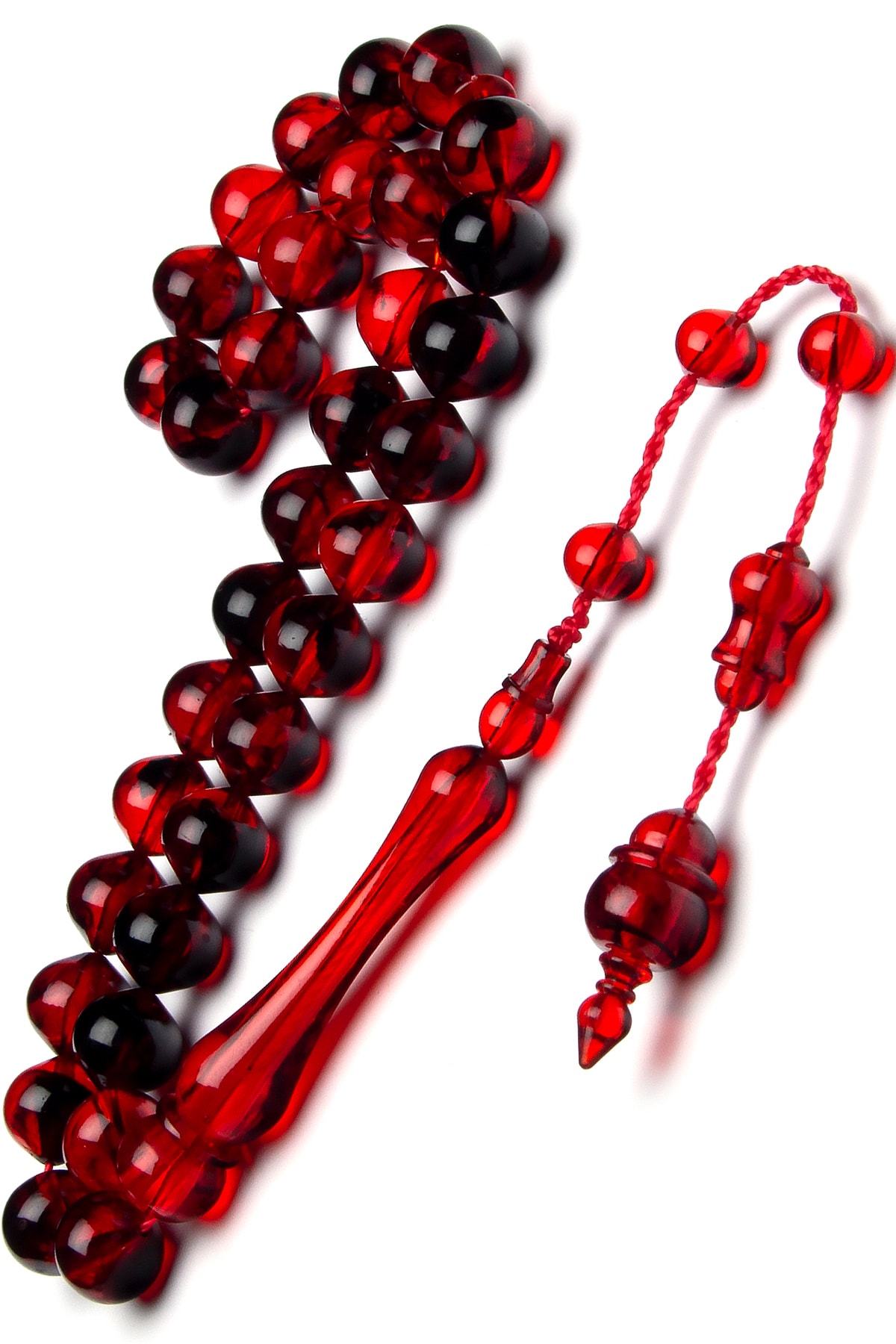Sistem Püsküllü 10mm Sığırcık Kesim Kırmızı Siyah Renk Süzmesi Akrilik Toz Kehribar Tesbih