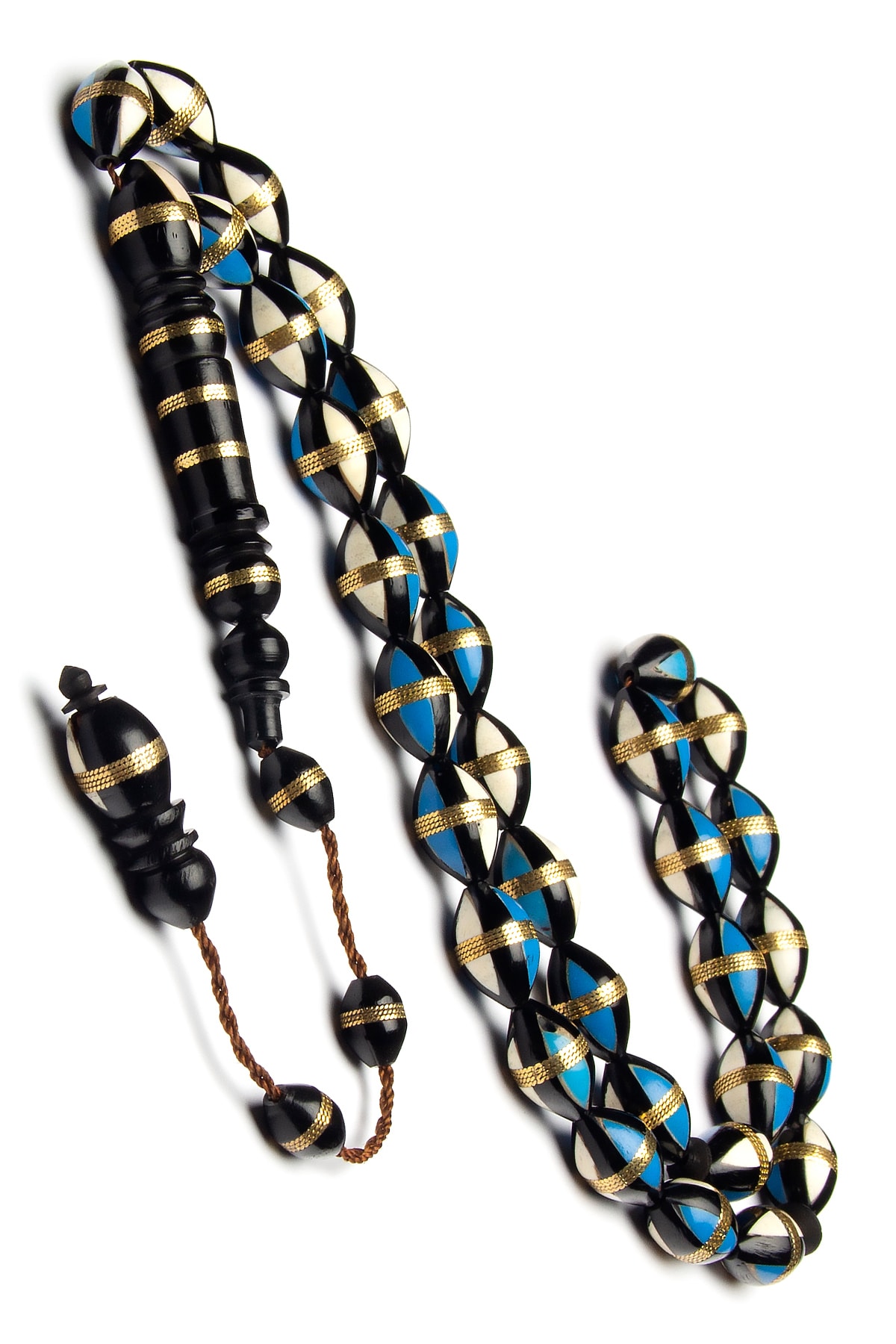Kuka ağacından üretilmiş olup, doğal ve otantik bir görünüm sunar; 7x11mm boyutlarındaki mineli püskül detayları ile estetik bir tasarıma sahiptir; Mavi ve beyaz renk kombinasyonu, zarif ve şık bir görünüm sağlar; Sistem püskül yapısı sayesinde tesbihin her bir püskülünde ayrı bir ritim ve ses çıkar, bu da meditasyon sırasında huzurlu bir atmosfer yaratır;