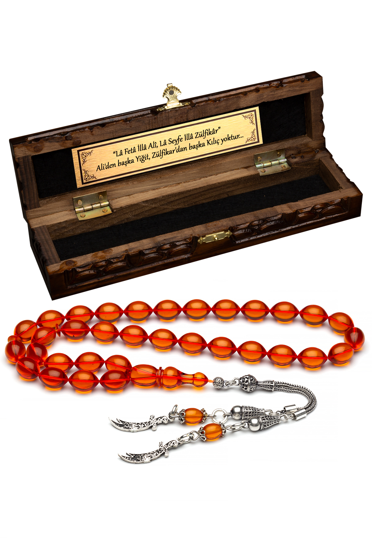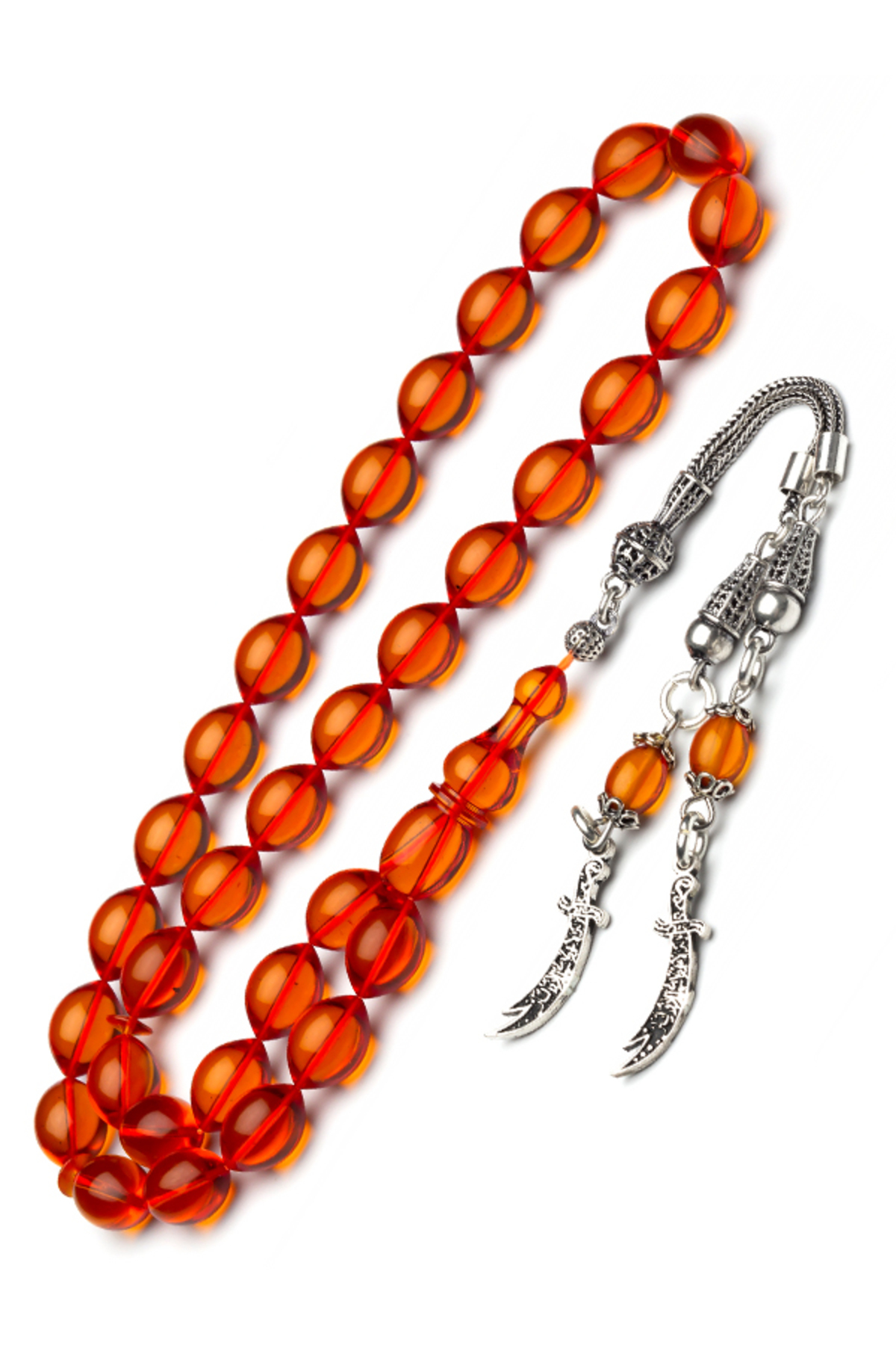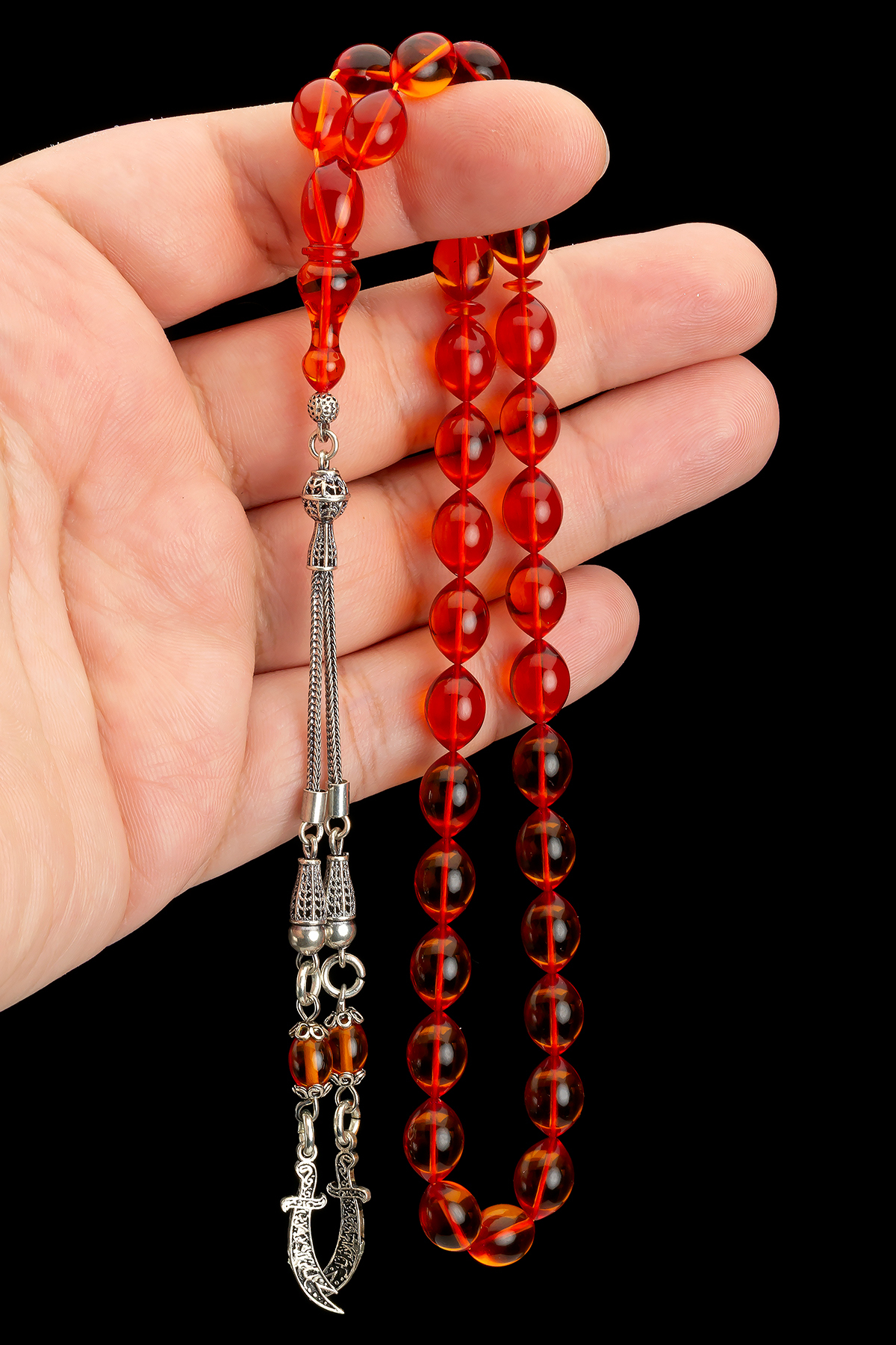 – Usta işçilikle şekillendirilmiş, her bir parçasında detaylara önem veren bir tasarıma sahip.; – 925 Ayar gümüş malzeme ile üretilmiş, kaliteyi ve dayanıklılığı ön planda tutuyor.; – Ateş kehribar taşı kullanımı sayesinde benzersiz ve göz alıcı bir görünüm sunuyor.; – Materyal bileşeni olarak %100 saf gümüş ve ateş kehribar kombinasyonu, hem estetik hem de değerli bir aksesuar deneyimi vaat ediyor.; – Şeffaf delim tekniğiyle işlenmiş püskül detayları, tespihin zarifliğini artırırken aynı zamanda farklı bir dokunuş katıyor.